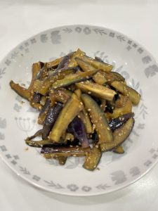 ②茄子を入れ、全体に油を吸わせるように軽く炒め、顆粒だしを入れさらに炒めて全体に火をとおす。